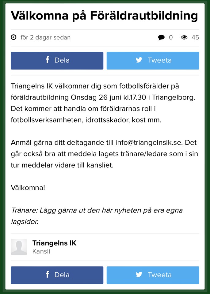 Triangelns IK välkomnar dig som fotbollsförälder på föräldrautbildning Onsdag 26 juni kl.17.30 i Triangelborg. Det kommer att handla om föräldrarnas roll i fotbollsverksamheten, idrottsskador, kost mm. Anmäl gärna ditt deltagande till info@triangelnsik.se. Det går också bra att meddela lagets tränare/ledare som i sin tur meddelar vidare till kansliet. Välkomna!