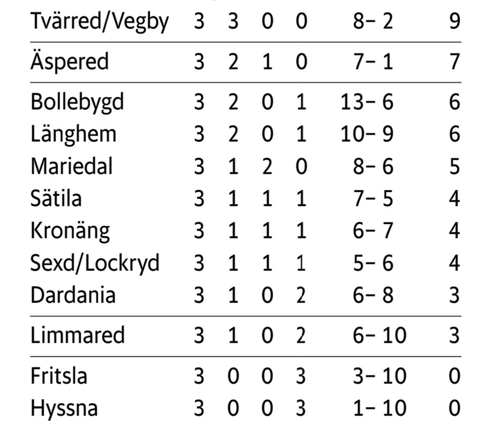 En sammanfattning av det senaste matcherna är på sin plats tycker vi, Äspered blev för svåra som sagt och vi fick vår första förlust. Men vi studsade tillbaka igen på ett mycket bra vis, Mariedal besegrades med 3-2. Efter en mållös första 45a så lossnade det ordentligt i början av andra, Super-Sebbe Svensson gör tre mål på 4 minuter! Ett äkta hattrick!! Mariedal kom starkt tillbaka men deras andra mål kom just i sista sekunden och vi vann en spännande match. Sexdrega/Lockryd väntade i matchen efter och det skulle bli en mindre välspelad match skulle det visa sig, S/L slog bara långbollar/lyckatillbollar upp mot vårt mål. Man kan tycka att matchen var jämn men när det väl fanns något spel så var det vi som stod för det. Sebbe satte en frispark till 1-0 och sedan slog han en hörna rakt i mål till två noll. S/L gjorde 2-1 i början av andra men vi gjorde strax efter deras mål 3-1 av Adam Svenson och matchen var avgjord. I skrivande stund så har några resultat gått vår väg och vi leder serien just nu med 5 poäng till Äspered och 6 poäng till Bollebygd. På onsdag tar vi emot Dardania på Bergavallen!