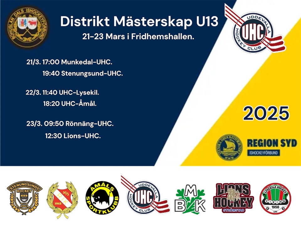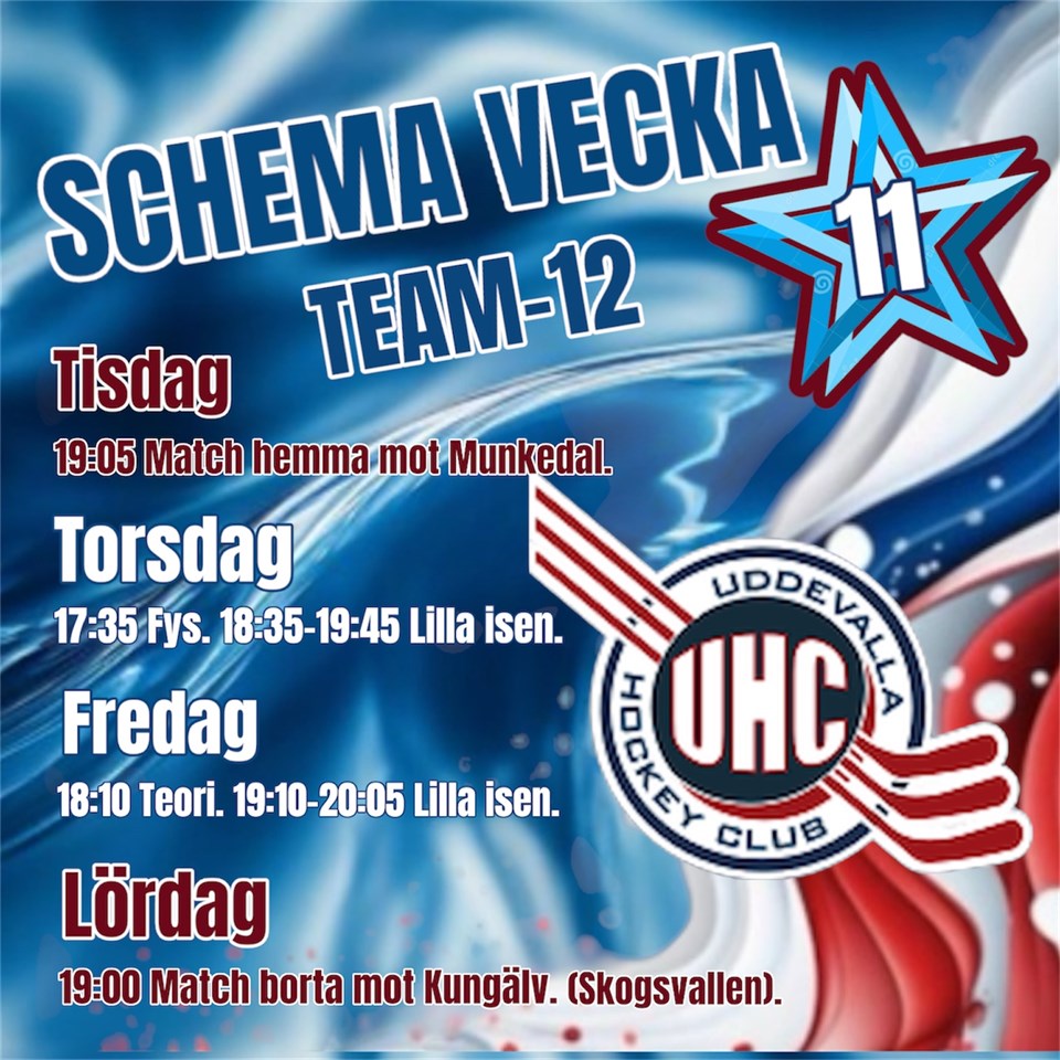 Under vecka 10 så har vi träningar tisdag, torsdag och fredag. På söndag har vi seriematch hemma i Fridhemshallen mot Stenungsund kl.11:40 är det nedsläpp. Vill man träna extra så kan man vara med Team-13 på måndag kl.18:00. Eller på onsdag med Team-11 kl.20:15. Vill även påminna om att under vecka 11, så har vi match hemma på tisdag mot Munkedal och lördag bortamatch mot Kungälv. Vecka 12 spelar vi DM fredag, lördag och söndag hemma i Fridhemshallen. Kallelse till matchen mot Munkedal och DM kommer senare under veckan. Hälsningar Ledarna Team-12 Team 12 2 mar 2025 6kommentarer