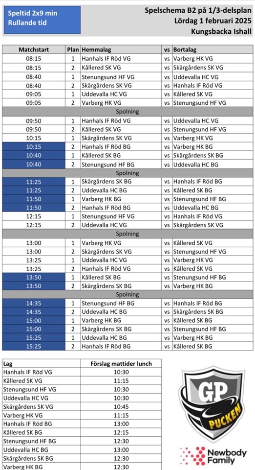 Då var det dags för slutspelet i GP-pucken nu på lördag 1/2 i Kungsbacka. Vi kommer ha två lag, och två olika samlingstider i Kungsbacka. Vi kommer möta Hanhals, Kållered, Stenungsund, Skärgården och Varberg. Killarna får lunch, men ta med lite mellanmål så man kan fylla på med energi. Ta med båda matchtröjorna och skridskoskydd. Lag Vit. Samling 07:30. Första matchen 08:40, sista matchen 13:25. Eddie William Otis Edvin Nicholas Loui Oscar Lag Blå. Samling 09:30 Första matchen 10:40, sista matchen 15:25. Sverre Douglas Casper Olle Charlie Melker Hugo F Hälsningar Ledarna Team-12