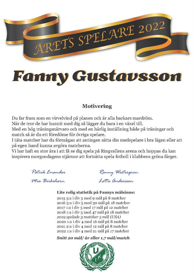 Som vanligt har årets priser delats ut på Ullfors IK:s årsfest på Karolas Kök den 5:e november. De tre priser som delas ut under kvällen var: Årets träningflit: Tilde Westergren med 87% träningsnärvaro Årets målskytt: Fanny Gustavsson med 21 mål på 17 matcher vilket var delad seger i div 4 Sen har vi det svåraste priset att dela ut men vi var rätt så överens om vilken priset skulle gå till i år. Läs gärna på diplomet lite fakta om hennes säsonger sen Ullfors IK Dam återuppstod för 8 år sen. Årets spelare: Fanny Gustavsson Damer 18 nov 2022 0kommentarer