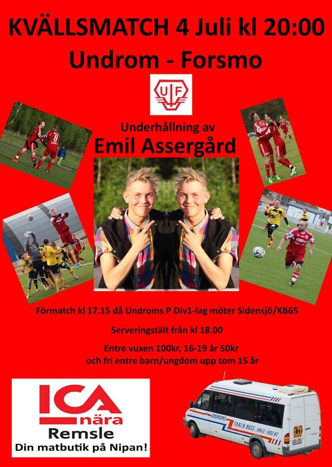 Årets KVÄLLSMATCH närmar sig och vi hälsar välkommen till Bohedsvallen lördag 4 juli kl 20.00. Då möts UNDROM - Forsmo i våromgångens sista match. Det spelas också en "förmatch" kl 17.15 då Undroms P Div1-lag möter Sidensjö/KB65. Serveringstält från kl 18.00 Inträdeskostnad vuxen 100kr, 16-19 år 50kr och fri entre barn/ungdom upp till 15 år. Underhållningen kommer från ingen mindre än EMIL ASSERGÅRD. Ingen har väl missat den grabbens framgångar och vi är jätteglada att han gästar sin "moderklubb" denna kväll. Välkommen till en toppenkväll / UIF Fotboll P div.1 23 jun 2015 0kommentarer