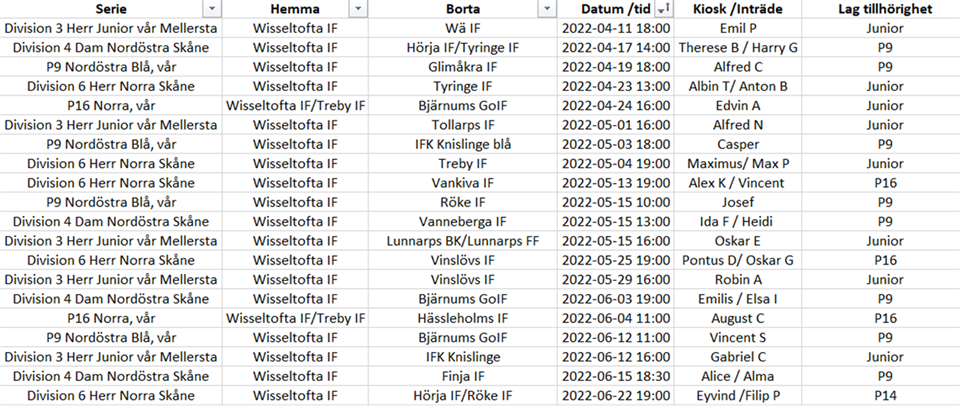 Nu drar serierna igång för våra lag, och därmed skulle vi vilja ha er support för bemanning vid intäde och kiosk. Vi har satt upp spelarens namn och tillhörande lag vid de tillfällen som vi skulle vilja ha er support. Ni skall vara på plats 45 min innan matchstart. Det är endast vid senior matcher (dam/herr) som vi tar inträde. Inträde tar vi fram till ca 30 min in i första halvlek. Kiosken kommer att låsas upp och låsas av respektive tränare/lagledare. Vid senior matcher (dam/herr) grillar vi korv, medans vid ungdom/ junior matcher endast kokt korv erjuds. Närmare instruktioner för inträde och kiosk hittar ni i kiosken. Om ni inte kan vid det usatta tillfället vill vi att ni meddelar Krister Persson detta (0709-980324), så ordnar han att ett byte sker. Ni hittar schemat under dokument och kiosk, https://www.laget.se/UNGDOMSLAG/Document Vid frågor kontakta Krister Persson på 0709-9803241 Tack för att ni ställer upp! Ungdomslag 5 apr 2022 0kommentarer