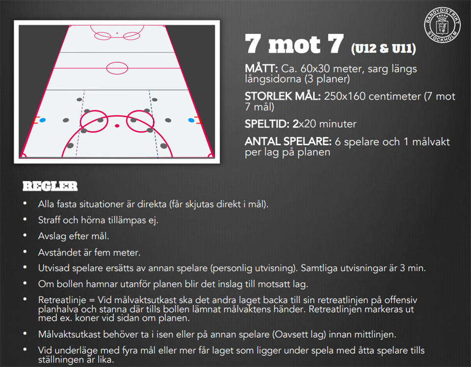Denna säsong ska vi börja spela 7 mot 7 (i första hand varianten "liten"). Skillnaden mellan 7 mot 7 (liten) och 5 mot 5 är i huvdsak att planen är större, att man kan bli utvisad och att retreatlinjen är framflyttad till kvartsplan (typ) i stället för mittlinjen. Se även bilden för mer info. /Frida