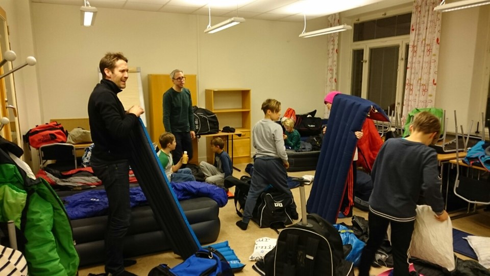 Vid 20-tiden ikväll är laget i stort sett installerade i skolsalen där vi ska sova. Madrasser och liggunderlag av skiftande tjocklek är utrullade. Självuppblåsande madrasser var i behov av mycket lungstöd. Fem minuter till arenan och ännu närmare till matserveringen. Vi är redo för morgondagens cupspel.
