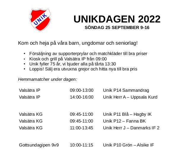 Vi försöker igen, söndag 25/9 firar Unik 75 år! Kom och ta en burgare och heja på våra lag!