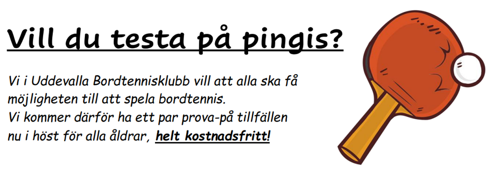 Välkommen att prova på Bordtennis hos oss i Uddevalla BTK. https://bit.ly/3QDQmnL Vi kommer ha prova-på dagar för alla åldrar vid olika tillfällen i September. Här finner ni infobladet: Prova-på inbjudan Ungdom prova på (upp till 18år) Tisdag 5 September 17:00-18:15 Söndag 10 September 15:45-17:00 Senior prova på (18-65år) Måndag 4 September 19:00-20:30 Måndag 11 September 19:00-20:30 Pensionär prova på (65+) "Halv elva hos oss" Vi kommer bjuda på fika i samband med denna träning. Inga förkunskaper behövs, alla är välkomna! Tisdagar 19/9, 26/9 och 3/10. Pingis 10:30-11:30 Fika 11:30-12:00 Parasport via FUOP Prova-på tillfälle genom FUOP's Nordiska Turnering. Information och inbjudan finner ni här: Parasport Nordisk Turnering Bordtennisen: Söndag 10 September 14:00-15:30 Info: -Vi har plats för 17st. -Vi har lånerack. -Inomhusskor rekomenderas starkt. -Omklädningsrum dam/herr finns. Anmälan: Först till kvarn, drop-in i mån av plats. uddevallabtk@telia.com 0723088629 Uddevalla BTK 24 aug 2023 0kommentarer