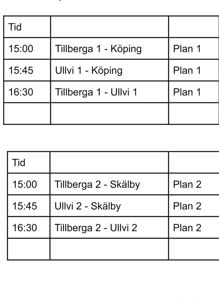 Vi samlas klockan 15:00 i Tillberga. Vi har första matchen 15:45.