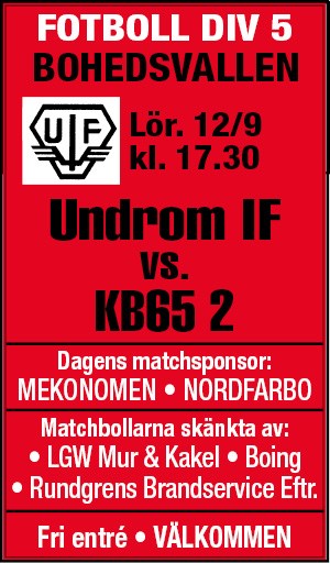Välkommen till Bohedsvallen på lördag. Näst sista hemmamatchen för Undroms A-lag, som tar emot gästande KB65 2. Dock med en lite udda matchtid, start kl 17.30. Som vanligt har vi fri entre'. /UIF Fotboll Undroms IF 10 sep 2015 0kommentarer