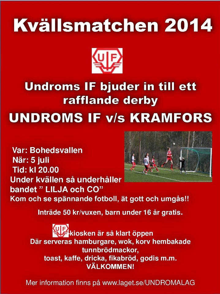 Välkommen till årets kvällsmatch som blir ett derby mellan Undrom och Kramfors! Kvällen bjuder även på underhållning av Lilja och CO och diverse ätbara godsaker! Ta med släkt, vänner och supportrar till Bohedsvallen och upplev en trevlig kväll tillsammans! Återigen varmt välkommen önskar Undroms IF! Undroms IF 1 jul 2014 0kommentarer