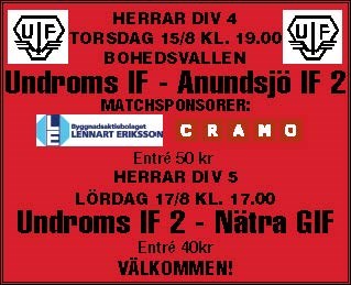 Välkommen till Bohedsvallen Tors 15/8 A-lagsmatch UIF - AIF 2, kl. 19.00 Lör 17/8 Herrar Div 5 UIF 2 - Nätra, kl. 17.00 / UIF Fotboll Undroms IF 12 aug 2013 0kommentarer