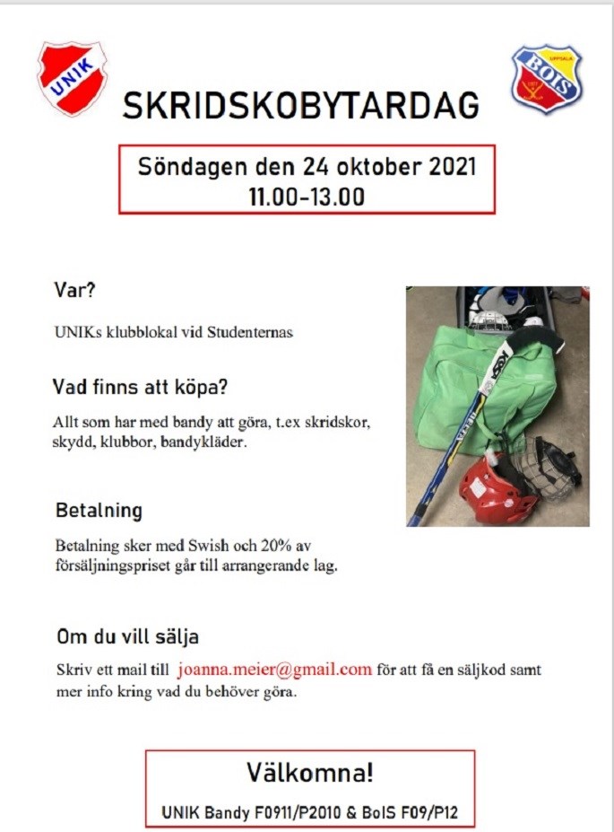 Behöver ni köpa eller sälja bandyutrustning kommer här ett ypperligt tillfälle. Skridskobytardag Söndagen den 24 oktober 2021 Kl 11.00-13.00 Uniks klubblokal Om du vill sälja Skriv ett mail till joanna.meier@gmail.com för att få en säljkod samt mer info kring vad du behöver göra.