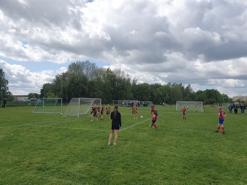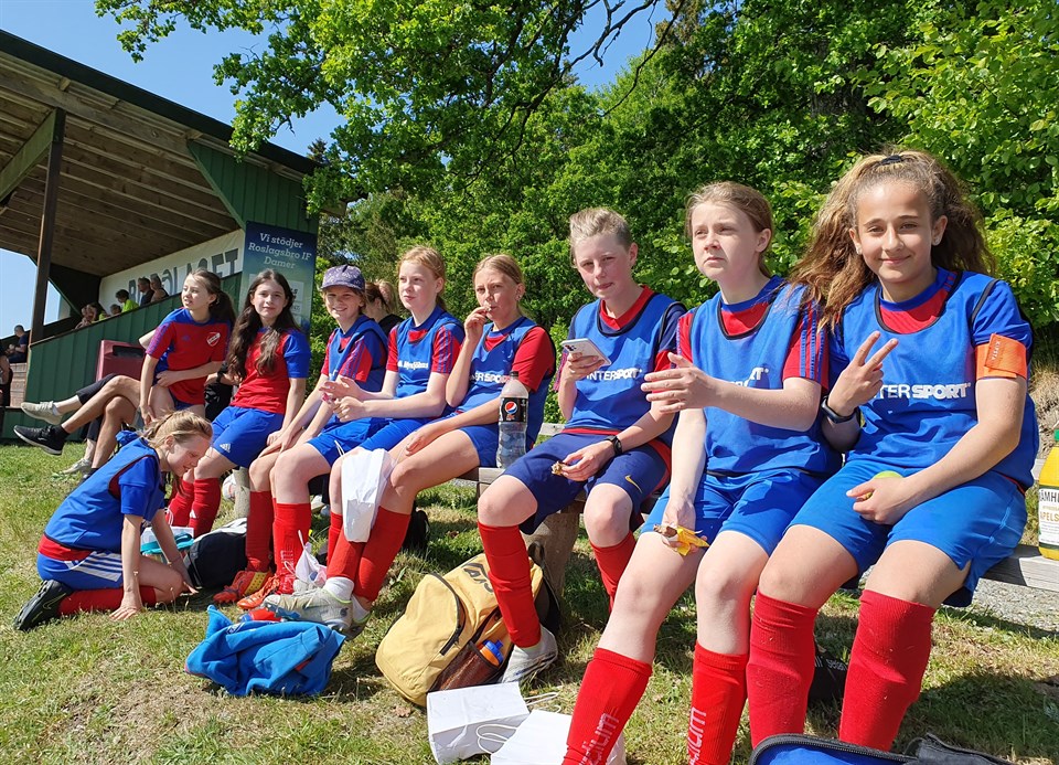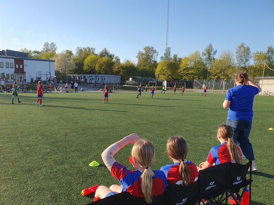 Det blev två bra och roliga matcher i värmen idag! Första matchen var på hemmaplan mot Örsundsbro. Deras lag var storleken större (födda 2010 och 2011) men det var inget som märktes på plan. Vi hade full kontroll från början till slut. Backarna släppte knappt igenom nått och framåt levererades det ena snygga anfallet efter det andra. Lameta jobbar hårt för att göra fler mål denna säsong än förra och samlade ihop ytterligare ett gäng mål. Dessutom placerade Stella en frispark precis i krysset. Historiskt! Efter matchen firade vi en rolig och välspelad match med fika som Amanda bjöd på. Tack för det! Under fikat konstaterade laget att det vinnande konceptet var att de hjälptes åt och hela tiden peppade varandra. Match nummer två spelades i Hagby ett par timmar senare. Där fick vi testa på en fin, men ganska krävande, gräsplan eftersom bollen inte alls rullade lika snabbt som hemma på konstgräset. Vi öppnade vi starkt med mål redan första matchminuten och det blev sedan en jämn match där både lagen gjort flera mål. Det gröna kortet gick till Vanja som kämpade på med skadad tå och hoppade in i målet den sista perioden. Efter matchen tog vi vägen förbi glasskiosken för att fira målfesten och svalka oss lite i värmen. En toppendag helt enkelt! PS. Det är många som har smycken på sig när de kommer för att spela match. Det bästa är om alla smycken stannar hemma eftersom de av säkerhetsskäl måste ta av allt under matchen. Det enda som är tillåtet är örhängen i nytagna hål. De ska då tejpas över. DS.