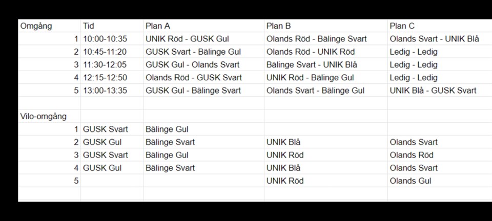 kl 9:00 samling på Gottsundagipen (Gottsundagipen). Om ni måste köra bil så är parkering nere vid Växthusets förskola, därifrån är det ca 500 meters promenad upp till Gipen. Kom dock gärna helst till platsen via cykel/gång om ni kan, så vi inte belastar parkeringsplatserna i onödan. Vi kommer alla (förutom parkeringsvärdarna) att behöva hjälpas åt att ställa iordning vid planerna och kiosken mellan kl 9:00-9:30. När sista matchen spelats behöver vi hjälpas åt att plocka ihop alla saker igen. kl 9:30 samlas tjejerna för att få tröjor och värma upp. Vi kommer spela i två lag, UNIK Röd och UNIK Blå, båda lagen spelar första omgången. Båda lagen kommer att spela 3 omgångar och vila i 2 omgångar. Matcherna är 2*15 minuter. kl 10:00 - 10:35 Första omgången kl 10:45 - 11:20 Andra omgången kl 11:30 - 12:05 Tredje omgången kl 12:15 - 12:50 Fjärde omgången kl 13:00 - 13:35 Femte omgången Plan A 1. UNIK Röd - GUSK Gul 2. GUSK Svart - Bälinge Gul 3. GUSK Gul - Olands Svart 4. Olands Röd - GUSK Svart 5. GUSK Gul - Bälinge Svart Plan B 1. Olands Röd - Bälinge Svart 2. Olands Röd - UNIK Röd 3. Bälinge Svart - UNIK Blå 4. UNIK Röd - Bälinge Gul 5. Olands Svart - Bälinge Gul Plan C 1. Olands Svart - UNIK Blå 2. Ledig 3. Ledig 4. Ledig 5. UNIK Blå - GUSK Svart Kom ihåg: - Blå shorts, röda strumpor, benskydd och vattenflaska. - Förstärkningskläder efter väder (så tjejerna håller sig varma!) - Matsäck (så tjejerna håller sig mätta!) I kiosken kommer vi att sälja korv, kakor, kaffe och festis. Betalning i kiosk sker via Swish. Tveka inte att höra av er om ni har några frågor! /Tränarna UNIK F13 (genom Jonas Ödmark)