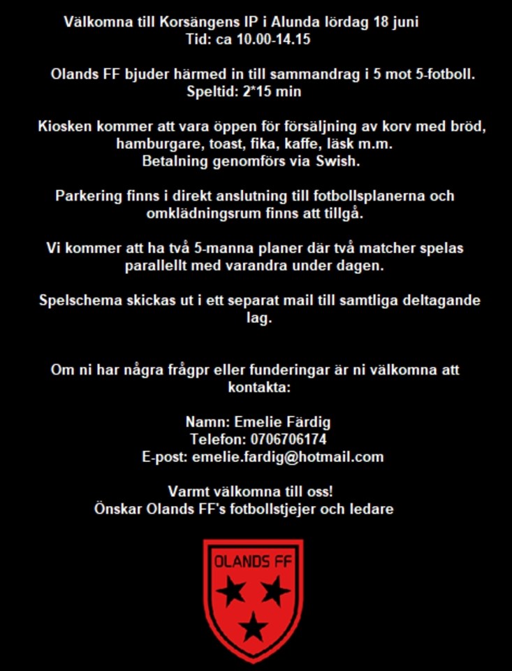 Information för er som är anmälda till poolspelet på lördag. kl 8:30 samling på parkeringen vid klubbstugan, Valsätra IP. Kl 8:40 avfärd mot Korsängens IP, Alunda, resan tar ca 40 min. kl 9:30 samlas tjejerna för att få tröjor och värma upp. Åter i Uppsala igen ca 14:40 vid Valsätra IP. Vi kommer spela i två lag, UNIK Röd och UNIK Blå. Matcherna är 2*15 minuter och spelas på 2 planer mellan kl 10:00 - ca 13:40. 10:00 - 10:35 Plan A UNIK Röd - Olands Röd 10:45 - 11:20 Plan A UNIK Blå - Olands Svart 10:45 - 11:20 Plan B UNIK Röd - GUSK Svart 11:30 - 12:05 Plan B UNIK Blå - Bälinge 12:15 - 12:50 Plan B UNIK Röd - GUSK Gul 13:00 - 13:40 Plan A UNIK Blå - GUSK Svart Preliminär laguppdelning: UNIK Blå Elvira Ödmark Esther Jafner Elise Bäckman Elsa Israel Helga Bergsten Rebecka Naraghi UNIK Röd Wilma Essén Miriam Troeng Lilly Kamariza Nardos Hagos Siri Starec Böckman Camilla Peuckert Kom ihåg: - Blå shorts, röda strumpor, benskydd och vattenflaska. - Förstärkningskläder efter väder (så tjejerna håller sig varma!) - Matsäck (så tjejerna håller sig mätta!) Kiosken kommer sälja korv, hamburgare, toast, fika, kaffe, läsk. Betalning via Swish. Tveka inte att höra av er om ni har några frågor! /Tränarna UNIK F13 (genom Jonas Ödmark)