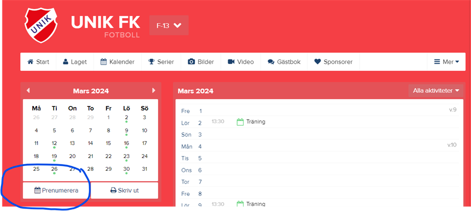 Nu börjar fotbollssäsongen så sakteliga dra igång på riktigt igen! I kalendern här på laget kan man se när nästa träning är, om man klickar på "Premenurera" under kalendern finns information för att synka in F13-lagets kalender i din privata kalender så ni inte missar något! Den 12:e mars drar vi igång med träningar ute igen, och då är det tisdagar 16:30-18:00, samt att vi har innetiderna på lördagar 13:30-15:00. I maj släpps det nya tider. Följande träningar är de kommande passen: 3e feb 13:30-15:00 INNE 10e feb 13:30-15:00 INNE 17e feb INSTÄLLT (SPORTLOV) 24e feb 13:30-15:00 INNE 2e mars 13:30-15:00 INNE 9e mars 13:30-15:00 INNE 12e mars 16:30-18:00 UTE 16e mars 13:30-15:00 INNE osv.. F-13 2 feb 2024 0kommentarer