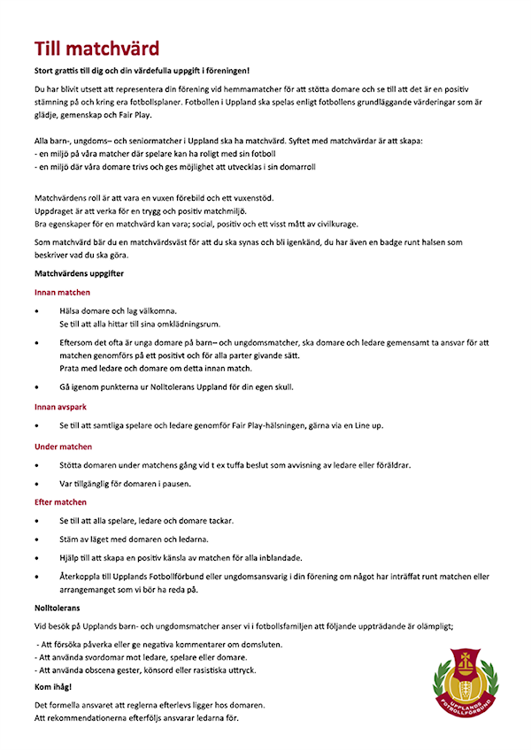 Som matchvärd hjälper du till med att det ska vara god stämning under sammandraget. Tillsammans med oss ledare hjälper matchvärdarna även till med att förbereda planerna inför första match samt plocka i ordning efter att de sista matcherna har spelats. Som bonus kommer du som matchvärd att få bära en fin väst. Västar fixar vi, de får ni på plats. Det finns en enkel och tydlig instruktion för matchvärdar från Upplands fotbollsförbund som kommer att skickas ut.
