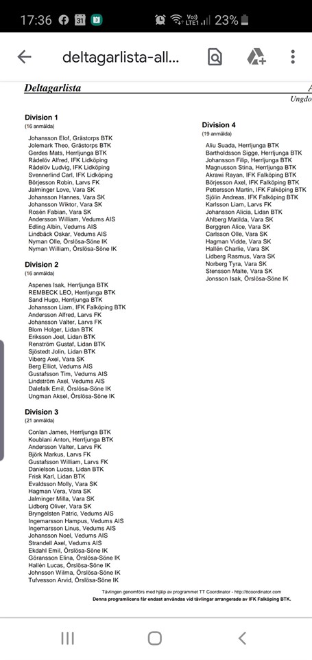 Här kommer startlistan för touren! DIV 3 starttid 09,00 Linus Ingemarsson Hampus Ingemarsson Axel Strandell Noel Johansson Patrik Bryngelsten Theodor Sturesson DIV 2 starttid 14,00 Eliot Berg Tim Gustavsson Axel Lindström DIV 1 starttid 14,00 William Andersson Albin Edling Oskar Lindbäck Bordtennis 3 dec 2019 0kommentarer