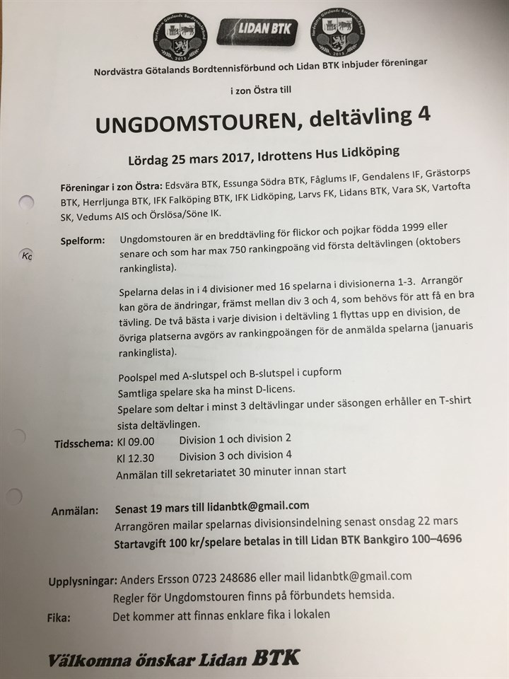 Hej på er, ni som är på hugget och vill vara med på deltävling 4 som går av stapeln i Lidköping den 25/3, anmäler er till någon av oss ledare så snart som möjligt men senast 22/3.