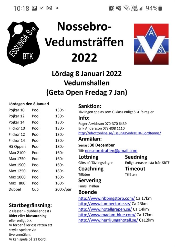 På Lördag 8 Januari genomförs Nossebro - Vedumsträffen i vedumhallen! OBS ANMÄLAN OMGÅENDE TILL nossebrotraffen@gmail.com Bordtennis 31 dec 2021 0kommentarer