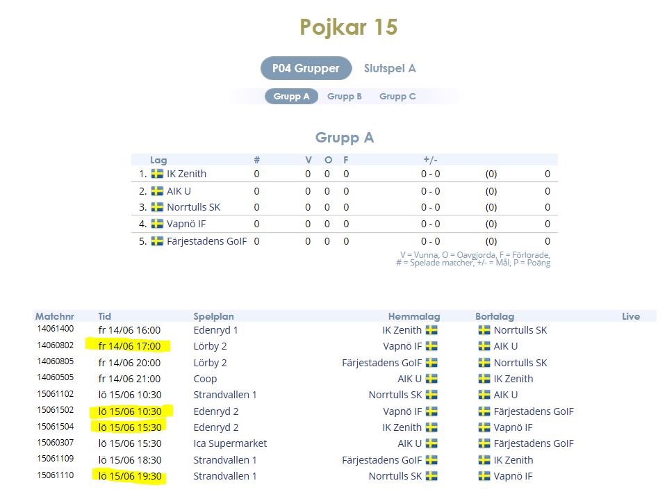 Schema Sölvesborgscupen Fredag Samling Vapnö IP 13:00 Avfärd 13:15 (Två bussar o en husbil) Runt 15:00 stannar vi någonstans för intag av energi, antingen medhavd macka etc, eller får var och en handla macka/frukt eller liknande där vi stannar. (Egen utgift) 16:00 Framme vid spelplats ”Lörby 2” 17:00 Match mot AIK 2x 25minuter 18:15 10 minuters resa till Hjortakroksskolan 18:30 Dusch, Incheckning 19:30-20:00 Middag 20:00-23:00 Chill på skolan Lördag: 08:30 Frukost 09:30 Avresa match 10:30 Match mot Färjestaden vid spelplats ”Edenryd 2” 12:00-13:00 Lunch 14:30 Fylla på energi, frukt? 14:40 Avresa match 15:30 Match mot Zenith vid spelplats ”Strandvallen 1” 17:30-18:15 Middag 18:30 Avresa match 19:30 Match mot LB07 21:00 Dusch 21:30 Kan bli aktuellt med mat på Donken? (Egen utgift) 23:00 Läggdags Söndag: 08:00 Frukost Schema beroende på resultat från lördagen, men en på förmiddagen, vid vinst en match till på eftermiddagen. Lunch mellan 11-14 beroende på schema Ladda ner cupens app på Appstore eller Google play, Sök Sölvesborgscupen Tider och planer kan ändras, så håll er uppdaterade via appen. Packlista Madrass, Sovsäck, Kudde, Sandaler, Laddare, pump, hygienartiklar, hörlurar, Ledare: Bollar, västar, medicinväska, konor, grenuttag, tejp, sax, ev papper för mörkläggning, öronproppar