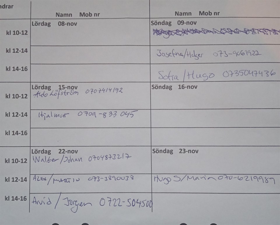 Vi bifogar schemat för er som redan har skrivit in er. Tack för ert stöd.