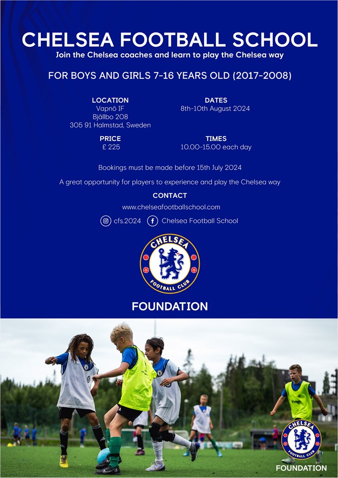 För första gången kommer Chelsea Football School till Sverige. Ett av tre stopp sker i Halmstad, där man såklart valt Vapnö IP som träningsområde. Väldigt hedrande för föreningen att få vara värd för detta. Chelsea Football School är en möjlighet för såväl tjejer som killar mellan 7-16 år att under några dagar få träna som akademilagen i Chelsea gör. Det är också en möjlighet att bli "sedd" av Chelseas scoutverksamhet och att kanske få möjlighet att knyta band för att gå utbildning och spela fotboll i England. Men arrangemanget är ändå för alla som skulle vilja testa på akademilivet några dagar samt inte minst för de ungdomar som kanske har Chelsea som favoritklubb. Mer om arrangemanget finns att läsa via denna länk. Max antal platser är 96 stycken. Anmälan är nu redan öppen, och tjejer och killar i Vapnö IF och klubbar i närområdet har nu möjlighet att lägga beslag på de första platserna. Via denna länk kommer man direkt till anmälningssidan för dagarna på Vapnö IP. Passa nu på att ta denna möjlighet. För övrigt även en riktigt bra present att ge bort till någon fotbollstokig, vare sig man är Chelsea fans eller inte.