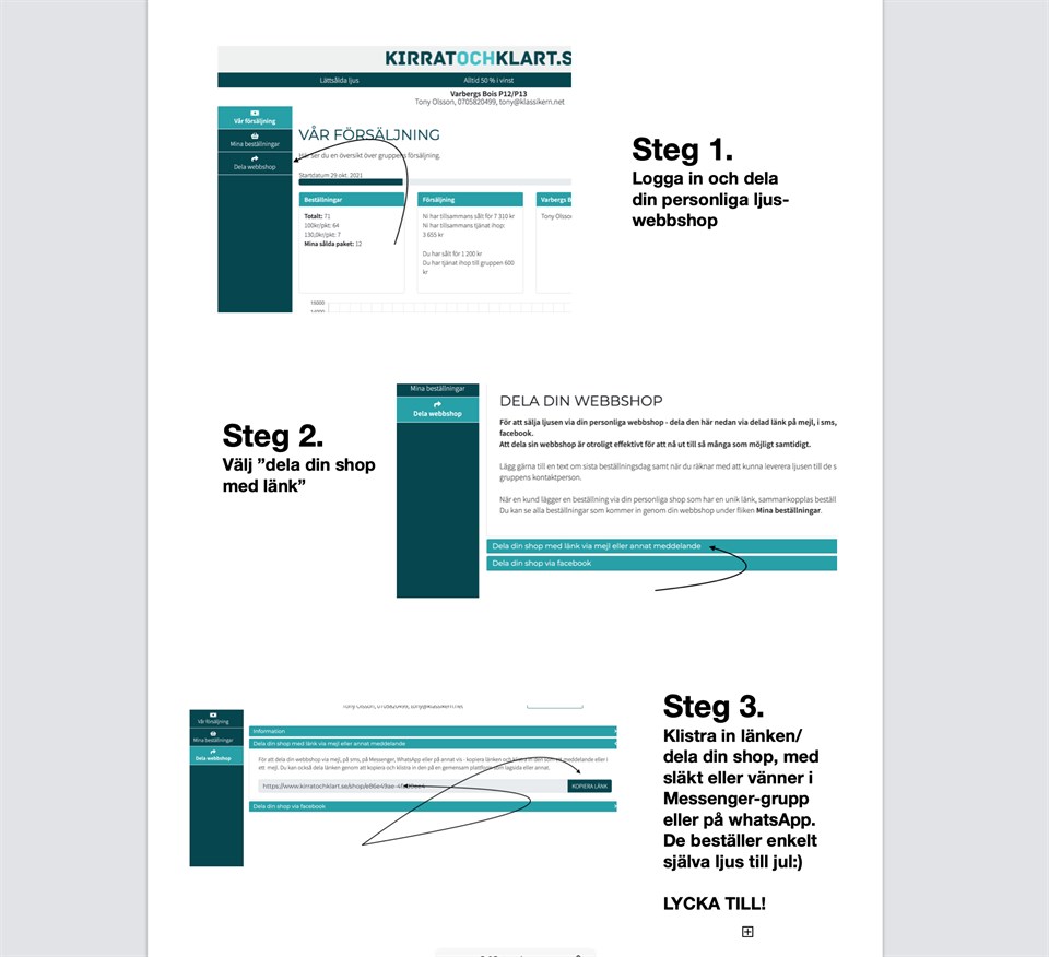 Hej på Er, Det ser lovande ut med ljusförsäljningen för P09. Vi har redan dragit in nästan 4.000 kr till lagkassan. För er som inte börjat sälja ljusen ännu kommer här en vänlig påminnelse att registrera er på länken nedan. Ett tips efter registrering är att dela länken till webbshopen via "Mina sidor" till släkt och vänner, via Messenger, WhatsApp eller liknande. Bifogat ser ni en kort instruktion hur det går till att skapa länken. Lycka till! Med vänlig hälsning, Jonas Registrera dig här! P15 7 nov 2021 0kommentarer