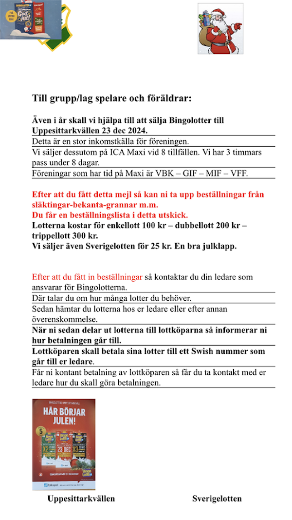 För er som är intresserade av att köpa bingolotter till den 23/12 har ni nu möjligheten att stödja VFF och p13. Se på bifogad bild vilka lotter som kan köpas och skicka beställning till Jeanette via sms 0706349611.