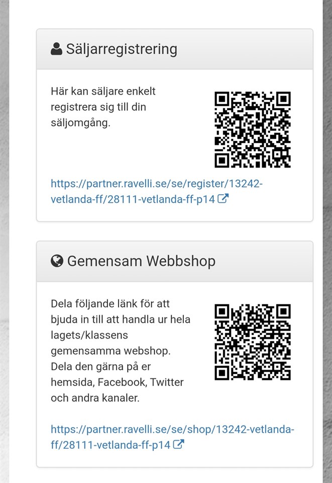 Nu är det dax för årets försäljning till laget. I år har klubben valt attsälja för Ravelli. Här kommer en länk där ni ska registrera er för att komma åt shoppen. Andra qr koden är för att länka ut på media och då kommer de till vår gemensamma sida. Vi har 45 dagar på oss att sälja så många paket som möjligt. Hör av er om det är något strul ska vi försöka lösa detta! Lycka till med försäljningen Johanna P14 4 aug 2025 4kommentarer