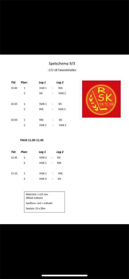 Hej! Detta riktar sig till de spelare födda 2017 som är anmälda till poolspelet. Övriga tränar som vanligt. Nu har info från Rydaholm, gällande helgens poolspel, kommit. Vi har anmält 2st lag och båda lagen kommer få spela 5 matcher vardera (se spelschemat). Första matchen är kl 10 och det är gemensam avfärd från Biltemas parkering 8.45. Väl på plats så går vi igenom och delar upp de två lagen. Njut av vårsolen så ses vi på lördag. //Ledarna Hockeyskolan 6 mar 2024 0kommentarer