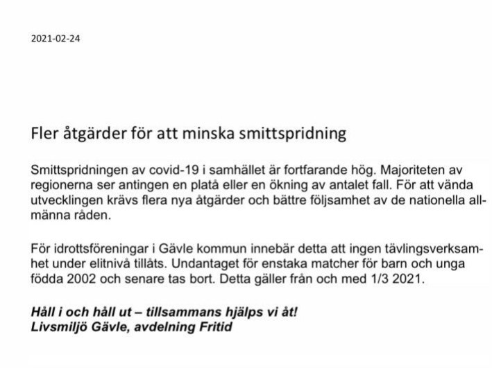Från och med måndag 1 mars får inga matcher genomföras, men vi får fortsätta med träningar. Nu fokuserar vi på det positiva och håller i och håller ut. Träning imorgon :) Och match på lördag, förmodligen säsongens sista... U-15 Team 11 24 feb 2021 0kommentarer