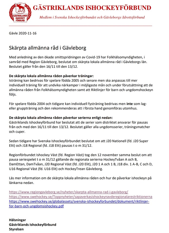 Skärpta allmänna råd i Gävleborg. Med anledning av den ökade smittspridningen av Covid-19 har Folkhälsomyndigheten, i samråd med Region Gävleborg, beslutat om skärpta lokala allmänna råd i Gävleborgs län. Beslutet gäller från den 16/11 till den 13/12. För vårt lag gäller: - Matcher inställda. - Träning som vanligt. Kolla gärna klubbens sida med samlad info om Covid-19 http://www.valbohc.se/Page/417483 Länk till Gästriklands Ishockeyförbund https://www.gastrikehockey.com/Nyheter/Egnanyheter/UppdateradinformationmedanledningavCovid-19 U-15 Team 11 16 nov 2020 0kommentarer
