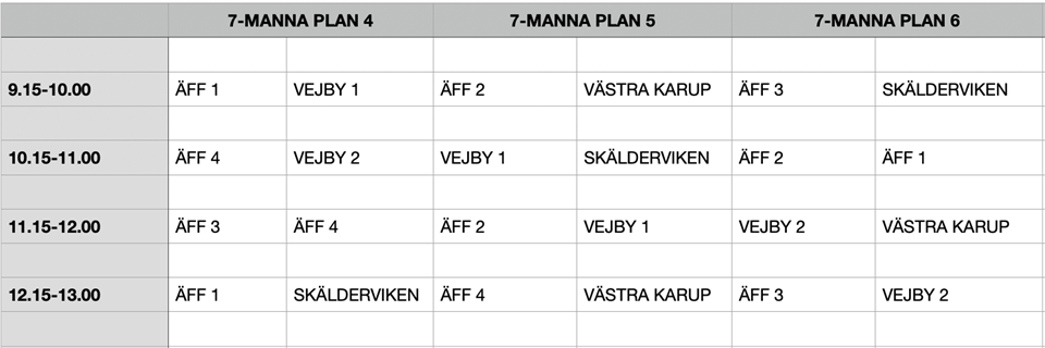 Matcherna spelas på tre olika planer och alla lag spelar tre matcher.  Matcherna är 2x20 min och sen är det 15 min paus mellan matcherna för flytt mellan planer samt nedvarvning/uppvärmning. Schema för matcherna ser ni bifogat.