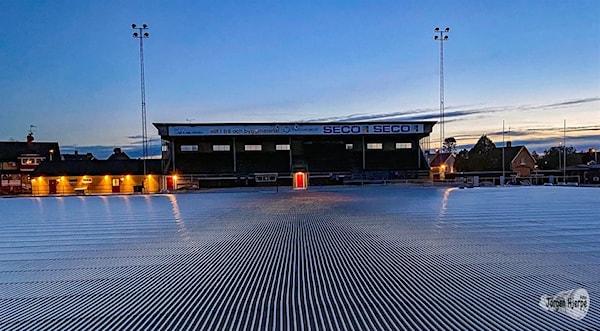 BILDEN: Arbetet med att få slangen för kylmedel på plats på Västanfors IP är snart klart. Slangen ska sedan täckas med stenmjöl.