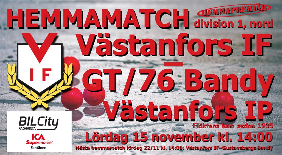 Efter två raka bortamatcher, som skulle ha varit tre, är det på lördagseftermiddagen dags för Västanfors Bandy att begå hemmapremiär. Gästar IP gör GT/76 Bandy.