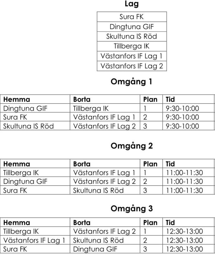 Nu är det dags för poolspel igen. Lördagen den 25/5 på Ekängens IP i Surahammar. Bifogat finner ni spelschemat för dagen. Samling på Ekängens IP senast 09:00 Praktisk info: • Matchtider: 3x10 min. • Kiosk med försäljning av hamburgare, fika och dryck kommer finnas. • Omklädningsrum ej tillgängligt. • Vid Ekängens IP finns toalett och möjlighet att fylla vattenflaskor vid behov. • Parkering finns vid Ekängsbadet i anslutning till 5m5-planerna Viktigast av allt är att vi håller en god ton mot alla spelare, ledare, publik och våra domare. Alla behöver se till att de har med sig fotbollsskor, benskydd samt ett par röda fotbollsstrumpor. Övriga matchkläder tar vi ledare med. Kläder efter väder, matsäck samt något att sitta på mellan matcherna rekommenderas också (tex stol eller filt).