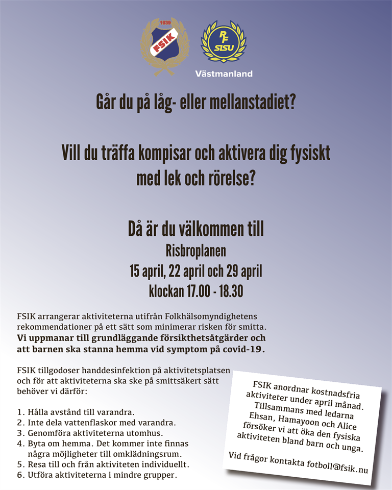 Hej Bifogar information om kostnadsfria aktiviteter för barn och ungdom som Södra anordnar i samarbete med RF SISU Västmanland. /Inger
