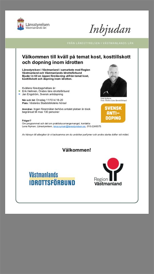 Den 11/10 är det en föreläsning om bla kost och kosttillskott inom idrott. Den är på Västerås Stadsbibliotek i deras hörsal och är mellan 18-20. Det behövs ingen föranmälan men finns endast 130 platser. Varmt välkomna