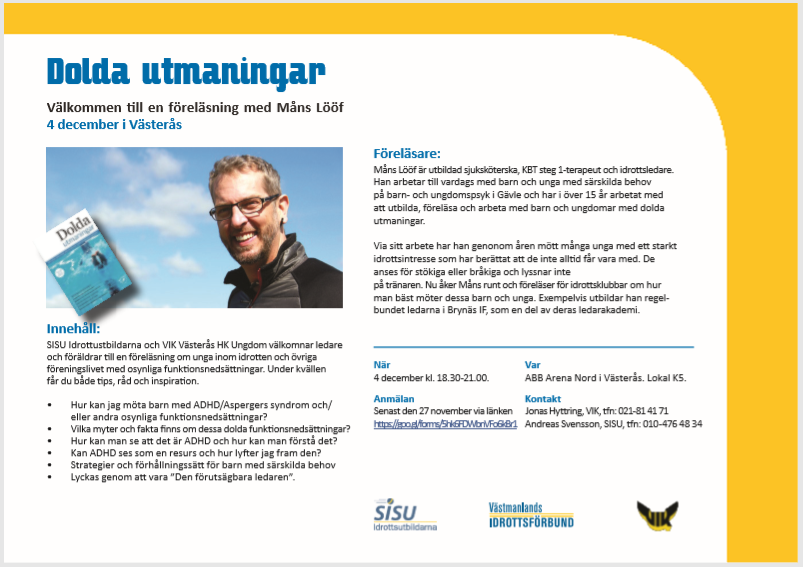 Vänder sig till föräldrar och ledare Vi välkomnar Måns Lööf till VIK Hockey igen för att hjälpa oss ledare och föräldrar att skapa en bättre miljö för våra hockeyspelare som har en dold funktionsnedsättning som ex. ADHD. För oss som varit med på föreläsningen, så öppnade sig en ny värld och vi fick många bra förklaringar på varför det blir som det blir och hur vi tillsammans med barnen kan vända motgångar till framgångar. Jag är stolt över att kunna säga att jag idag är en bättre ledare än vad jag var innan jag träffade Måns. Hälsningar Jonas Hyttring, Ansvarig för High Five Tid: 4 december kl. 18.30 - 21.00 Plats: ABB Arena Nord, Lokal K5 Anmälan: https://goo.gl/forms/5hk6FDWbnVFo6kBr1 Inbjudan i sin helhet nedan. SISU Idrottustbildarna och VIK Västerås HK Ungdom välkomnar ledare och föräldrar till en föreläsning om unga inom idrotten och övriga föreningslivet med osynliga funktionsnedsättningar. Under kvällen får du både tips, råd och inspiration. • Hur kan jag möta barn med ADHD/Aspergers syndrom och/ eller andra osynliga funktionsnedsättningar? • Vilka myter och fakta finns om dessa dolda funktionsnedsättningar? • Hur kan man se att det är ADHD och hur kan man förstå det? • Kan ADHD ses som en resurs och hur lyfter jag fram den? • Strategier och förhållningssätt för barn med särskilda behov • Lyckas genom att vara ”Den förutsägbara ledaren”. Föreläsare: Måns Lööf är utbildad sjuksköterska, KBT steg 1-terapeut och idrottsledare. Han arbetar till vardags med barn och unga med särskilda behov på barn- och ungdomspsyk i Gävle och har i över 15 år arbetat med att utbilda, föreläsa och arbeta med barn och ungdomar med dolda utmaningar. Via sitt arbete har han genonom åren mött många unga med ett starkt idrottsintresse som har berättat att de inte alltid får vara med. De anses för stökiga eller bråkiga och lyssnar inte på tränaren. Nu åker Måns runt och föreläser för idrottsklubbar om hur man bäst möter dessa barn och unga. Exempelvis utbildar han regelbundet ledarna i Brynäs IF, som en del av deras ledarakademi.