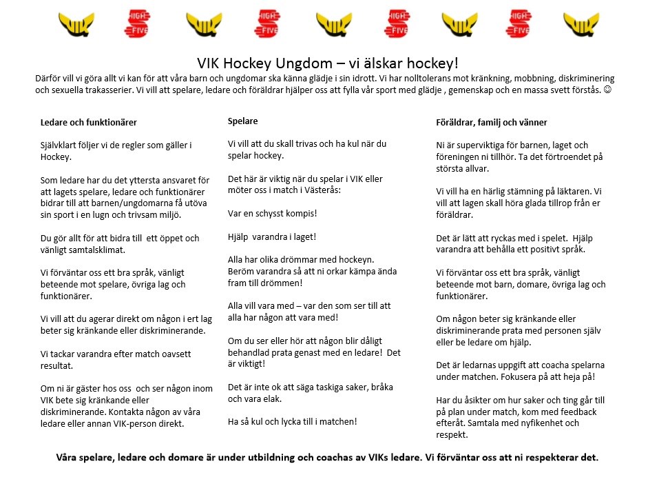 Nu finns ett dokument som vi kan använda oss av för att visa gästande lag hur vi vill ha det på plan och läktare under poolspel och matcher i VIK. I dokumentet finns en beskrivning av vilket beteende vi tycker skapar en bra miljö för barn att idrotta i. Det finns tre texter - en till ledare, en till spelare, en till föräldrar. Tanken är att det ska vara kort, lätt att läsa och förstår. Använd fritt, skicka ut inför match, sätt iupp i lokaler etc. Självklart får ni dela det med spelar och föräldrar i VIK: Det är bra om alla har en gemensam referensram för önskvärt beteende. Testa och kom med feedback till oss så att vi kan utveckla dokumentet. Med Vänlig High Five Pia Andersson 073-251 94 45 piamargaretaandersson@gmail.com Jonas Hyttring 070-766 96 17 jonas.hyttring@axalon.se VIK Ledare 12 nov 2018 1kommentar