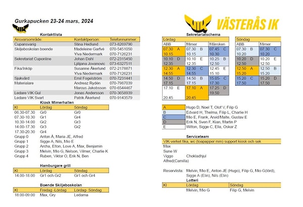 Hej gänget! Vi (Noels föräldrar) är ansvariga för sekretariatet under cupen, grupp A. Noels pappa är dock nyopererad och får inte köra bil eller stödja sig på benet. Vi har en liten tjej på 3 år som vi har fixat barnvakt till fre-lör för att jag ska kunna vara med och hjälpa till på lördag FM. Men sista passet på lördag skulle vi behöva bli av med, och även passet på söndag då jag är tränare för dottern och vi åker till Sthlm på match. Finns det någon vänlig själ som skulle kunna tänka sig att hoppa in istället för oss på dom passen? Lite typiskt att operationen skulle vara precis innan cupen, ber om ursäkt för krånglet :(
