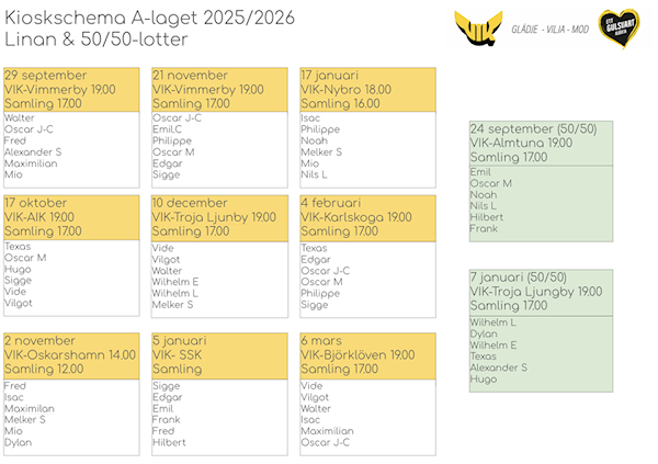 - Fullständiga riktlinjer för kioskarbetet finns i mappen Kioskschema A-laget 25/26.