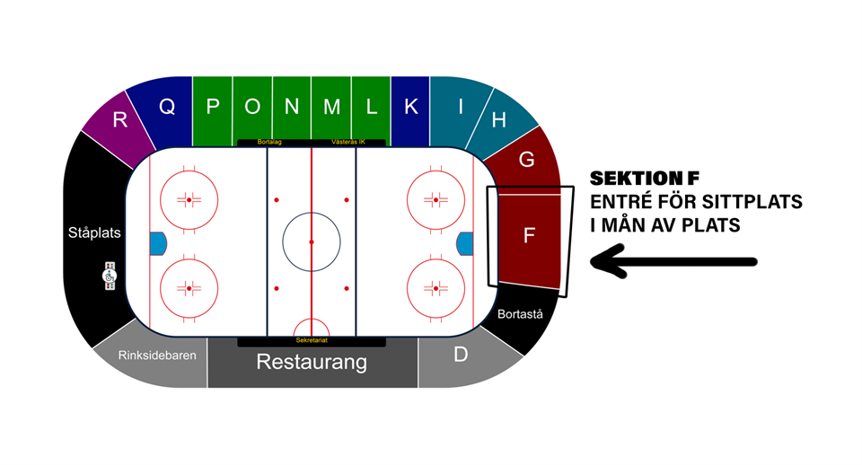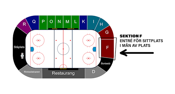 Primärt gäller ståplats för ungdomar och ledare som nyttjar gratis inträde. I mån av plats erbjuds möjlighet att sitta på sittplatssektion F. Respektera att detta endast gäller sektion F. I mån av plats innebär att du behöver vara säker att det finns lediga stolar på sektion F. Därmed behöver du vänta minst 10 minuter av första perioden innan du upptar en plats där. Ingång till sektion F ser du på bifogad karta.