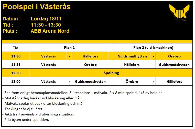 Hej, Här kommer allmän info för poolspel 18/11 + lite övrig info. Poolspel 18/11 i ABB nord Lördagen den 18/11 är det dags för poolspel i ABB nord. Första poolspelet för säsongen då vi av olika anledningar valt att avstå de första 2 poolspelen. Alla spelare som är kallade har fått en kallelse. Samling för spelarna 10:30 i omklädningsrummet. Innan och under dagen behöver vi hjälp av er föräldrar med praktiska saker och då vi inte är så många spelare så måste vi alla hjälpas åt med följande; - Innan spel lägga ut låga sarger så att det skapas två mindre spelplaner, en på varje planhalva. Efteråt plocka bort sargerna. - En tidtagare som håller koll på matchtiden. - Vi tänker oss erbjuda försäljning från "stora" kiosken i ABB men även erbjuda eget fikabröd. Linda Saleback ansvarar för kioskverksamheten men behöver hjälp att bemanna den. Vi ser även gärna att det finns några frivilliga som kan baka fikabröd. Detta då hembakat alltid brukar vara en succé. Svara gärna nedan redan nu vad ni kan vara behjälpliga med. Kommande poolspel Vad gäller poolspel efter den 18/11 så är kalendern nu uppdaterad med samtliga kommande poolspel under säsongen. Damasker Under kommande träningspass kommer damasker delas ut. Flera olika storlekar kommer finnas på plats så det flesta behov ska gå att tillgodose. Fotografering Onsdagen 22/11 kl 17:30 är det fotografering. Denna brukar ske i ABB Arena Syd i nordöstra hörnet. TIll denna fotografering önskar vi att alla kommer i full utrustning. Vi kommer att ha svarta matchtröjor på bilden. Matchtröjor kommer att finnas på plats att låna. F10 10 nov 2023 6kommentarer