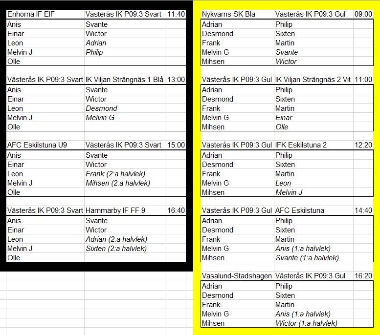 Hej! Vi spelar seriematcherna nu i veckan med följande lag: Onsdag borta mot Hallsta: Anis, August, Frank, Leon, Lukas, Melvin J, Melvin G, Mihsen, Måns, Olle (målvakt) Söndag hemma mot IFK Västerås: Adrian, Desmond, Einar, Martin, Melving G (målvakt), Olle, Philip, Sixten, Svante, Wictor Med vänlig hälsning, Ledarna