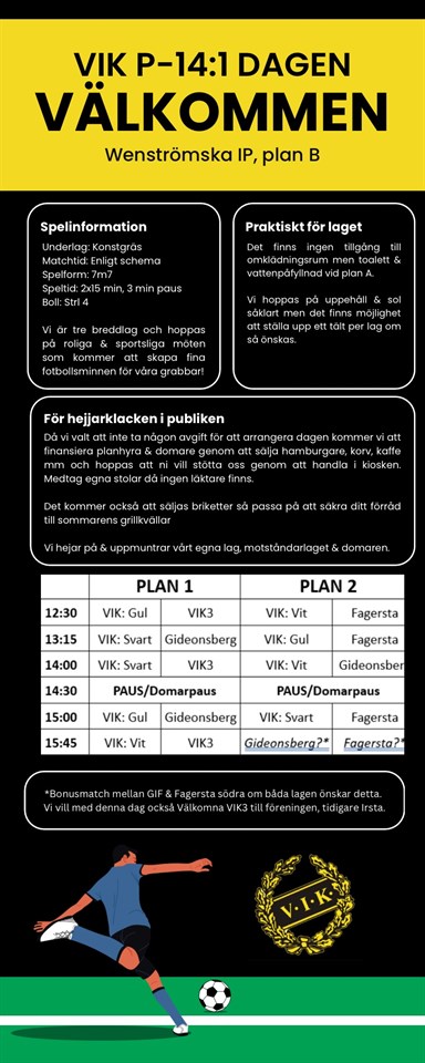 Nämligen lördag 20 april och vi hoppas att ni alla kan komma och göra denna dag till en fotbollsfest och kickstart på sommarsäsongen! Glöm inte att svara på anmälan här i laget om din grabb kommer eller ej så vi kan planera både lagen och dagen på ett ännu bättre sätt. Vi har bjudit in tre andra klubbar, varav ett lag, VIK3 sedan inbjudan gick ut har hunnit byta lagfärger och klubb från Irsta till VIK. Vi välkomnar dem till klubben som nu alltså har tre P-14 lag. Fagersta Södra och Gideonsbergs IF är de två andra lagen och ni hittar mer info om dagen samt spelschema i bifogad bild. Samma inbjudan som gått ut till våra motståndare. Ta med en vän, en släkting eller granne och kom och heja på våra små stjärnor som nu går in i sin första riktiga 7-mannasäsong!
