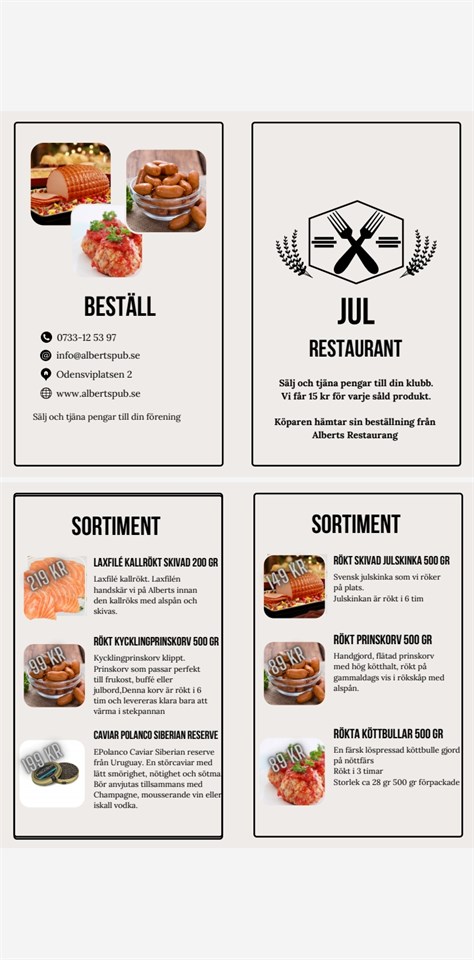 Vår stolta sponsor Alberts pub ger oss möjlighet att tjäna pengar till lagkassan och köpa god mat till jul och nyårsbordet. Smsa beställning på 0730938211 (Michael Redrin) senast 14/12 så kommer återkoppling från Micke när ni kan hämta upp det hos Albert pub. U15/U16 Svart 19 nov 2022 0kommentarer