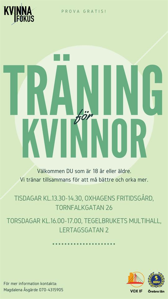 Nu flyttar träningen in igen! Tisdagar 13.30-14.30 Oxhagen fritidsgård Torsdagar 16.00-17.00 Tegelbruket - Multihallen Kvinna i Fokus 4 okt 2021 0kommentarer