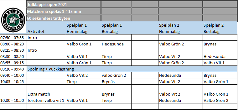 Hej alla glada hockeylirare. Vilka fantastiska insatser ni stod för idag. Valbo HC U10 vann 10 av 10 matcher idag. Hårt arbete och fokus på träningar ger resultat. Nedan finns lagindelningar (med reservation för ändringar). Kom ihåg inslagen julklapp. Valbo Grön 1 Lagledare Stefan och Fredik W Emanuel MV Vincent Milon Anton Denny Ossian Theodor Felix Valbo Grön 2 Lagledare Fredrik S och Fredrik G Mio MV Wilgot Noah Lily Isak Elis N Ludwig P Valbo Vit 1 Lagledare Patrik och Marcus Ture MV Theo G Liam F Wilton Liam S Theo H Emil Elis D Imorgon gör vi skillnad! Vi bidrar till hållbar samhällsutveckling och minskad klimatpåverkan! Mvh Ledare och Bubbelgrupp (genom Fredrik G) U-14 Team 12 11 dec 2021 3kommentarer